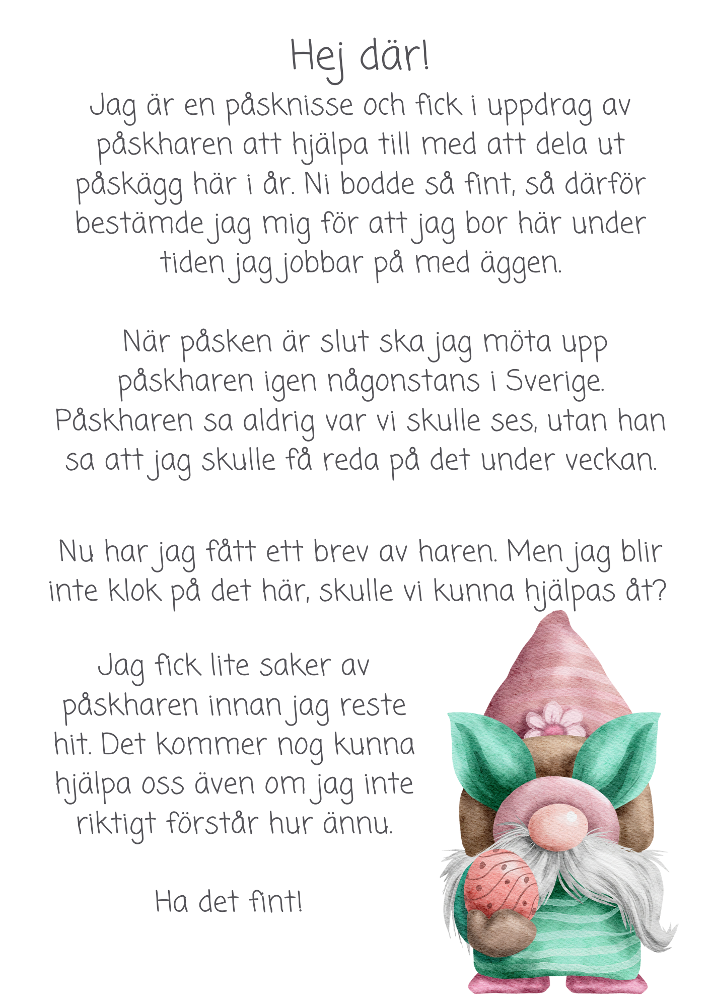 Observera att du behöver en spelledare som ger liv åt påsknissen och hans brev, så att spelet känns riktigt magiskt och engagerande.